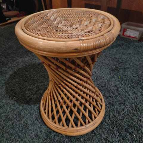 Ihana rottinkinen jakkara, istumakorkeus hyvä lisäistuimeksi olkkariin tai jalkarahiksi. Tyynyä en ole kerinnyt alkaa pesemään, helppo myös päällystää mieleisellään kankaalla.