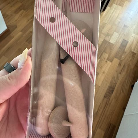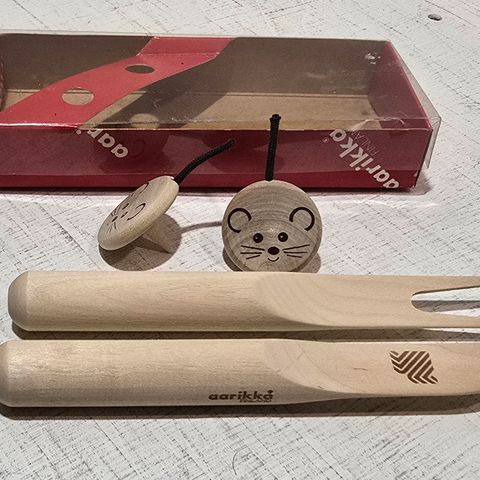 Aarikka juusto- ja tarjoiluaterimet. Settiin kuuluu pitkävartinen tarjoilulusikka, juustoveitsi sekä leviteveitsi. Aterimissa on puinen varsi ja metallinen terä/osa. Tarjoilulusikassa myös toisen yrityksen logo.