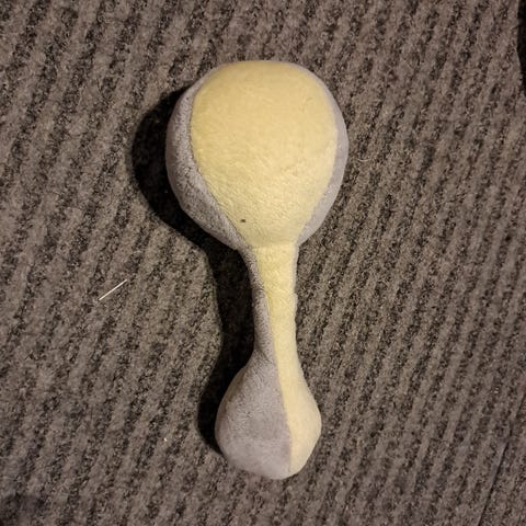 Kuvan kasa leluja, lisäksi silikoninen ruokailualusta sekä vesimaalauskuvia.