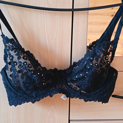 käyttämättömät mustat topatut pitsiliivit, koko 75B. Rintaliiveissä säädettävät olkaimet ja takakiinnitys. Päällinen pitsikangasta, sileä vuorikangas ihoa vasten.