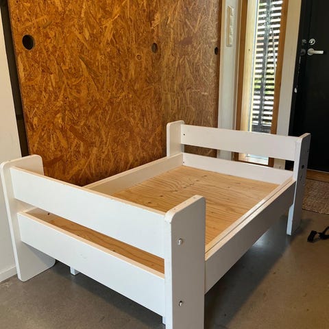 IKEA juniorisänky, väri valkoinen. Sänky on suunniteltu lapsille ja sopii siirtymävaiheeseen pinnasängystä isompaan sänkyyn. Materiaali on maalattua puuta tai puupohjaista levyä. Sängyssä on korkea pääty ja matalampi jalkopääty, jotka tukevat patjaa ja antavat suojaa nukkujalle. Soveltuu käytettäväksi lastenhuoneessa juniorikokoisen patjan kanssa.
