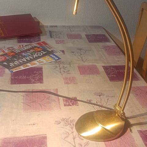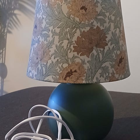 Pöytälamppu, jossa vihreä lasinen varjostin ja metallinen jalka. Lamppu on johdollinen ja siinä on pistotulppa. Varjostimen alta näkyy vaihdettava polttimo. Sopii esimerkiksi työpöydälle tai sivupöydälle yleis- tai lukuvaloksi.
