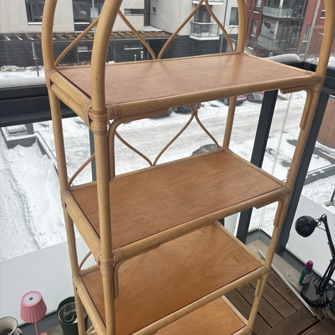 Kaunis rottinkinen hylly seinälle. Savuton ja eläimetön koti.