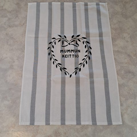 Uusi n.50x70cm keittiöpyyhe/leivinliina johon käsinpainettu sydän kuva ja mumman keittiö teksti.