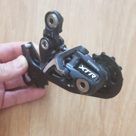 Shimano xtr takavaihtaja hiilikuitu häkillä ja xtr takapakka.