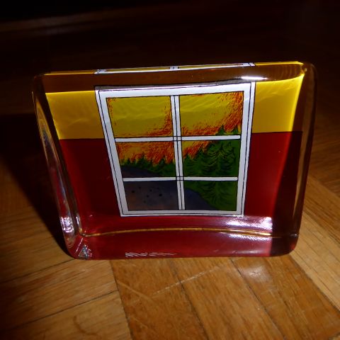 Heljä Liuklp-Sundströmin lasikortit, 2 kpl. Isompi lasikortti nimeltään "Sinessä taivaan keinuen" ja pienempi "Hohtavat hanget".