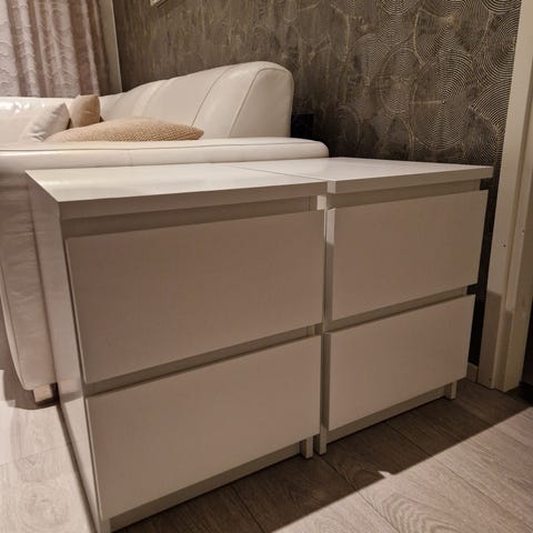 Myydään tarpeettomana 2kpl valkoiset IKEA:n Hemnes yöpöydät. Tason päällä käytönjälkiä.