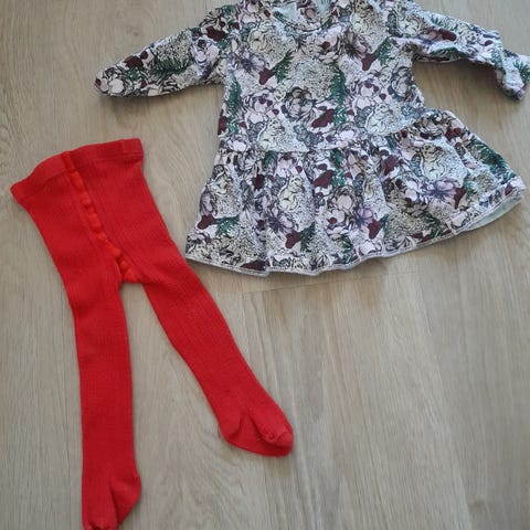 Tähtikuvioinen musta juhlamekko (ilmava, kerroksellinen) ja kultaiset sukkahousut. Sukkahousut hieman nyppyiset.