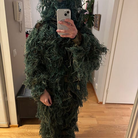 Maastokuvioinen asu, johon kuuluu takki, housut ja hattu. Sopii Airsoftiin.