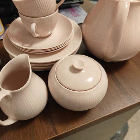Arabia kupit ja lautaset. Sarja sisältää korvallisia kuppeja sekä niihin sopivia lautasia. Materiaalina on keramiikka, pinnassa mattamainen lasitus. Väri on tumma, sinivihreään taittava sävy. Sopii esimerkiksi kahvi- tai teekupeiksi sekä tarjoiluun arjessa ja kattauksissa.
