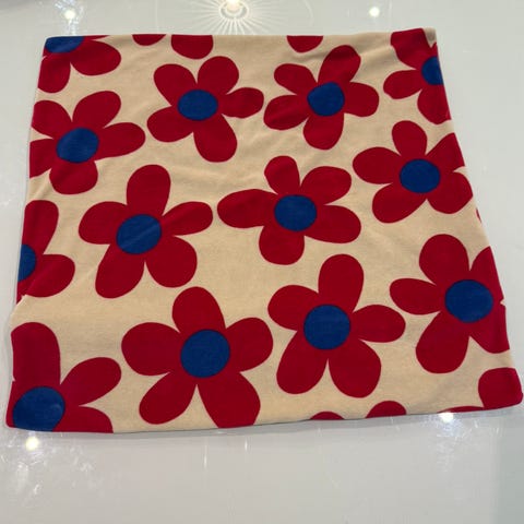 Kaksi pallokuvioista tyynynpäällistä. Kuviopuoli paksua kangasta, kääntöpuoli valkoinen, jossa vetoketju.