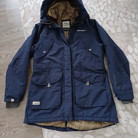Didriksons naisten ulkotakki, koko 42. Sininen takki, jossa on lämmin, tikattu vuori ja irrotettavalta vaikuttava huppu tekoturkisreunuksella. Edessä vetoketju ja nappi-/hakaskiinnitys sekä useita taskuja. Soveltuu arjen ulkoiluun ja yleiseen vapaa-ajan käyttöön viileässä säässä.