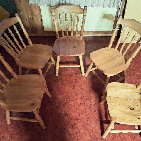 4kpl käytettyjä pinnatuoleja. Pintamaali rapistunut, mutta muuten hyvässä kunnossa! Istumakorkeus 42cm.