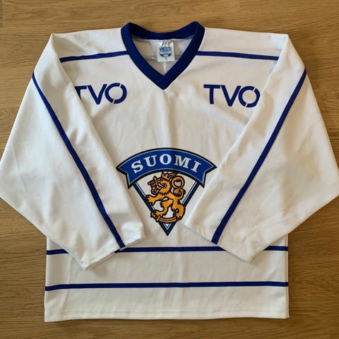 Sini-valkoinen Suomi jääkiekkopelipaita. Sopii jääkiekkoon ja muuhun vapaa-ajan käyttöön fanipaitana.
