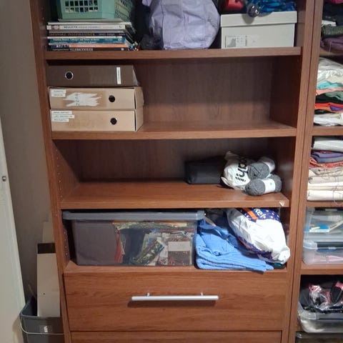 Hylly 2: Maalattu korallinpunaisella mattakalustemaalilla. Puuosissa joitain tahroja. Metallipinnoilla joitain jälkiä. Yleisilme kohtuullisen siisti.