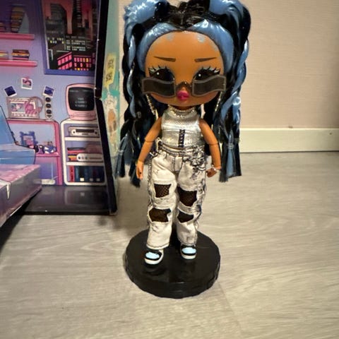 Nukke, jolla on pitkät vaaleat hiukset ja vaaleanpunasävyinen asu. Nukella on mekko, pusero, sukat ja kengät sekä vaaleanpunainen laukku. Mukana tulee lisäksi vaaleanpunainen takki tai viitta sekä muita pieniä asusteita. Sopii leikkeihin ja kokoelmiin, koko arviolta noin 25–30 cm.