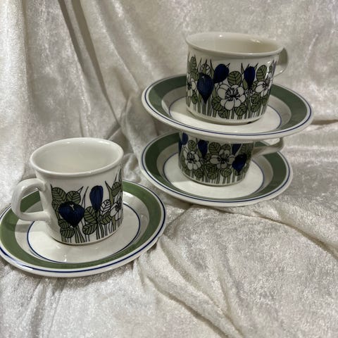 Arabia Krokus kahvikupit ja asetit kukkakuvioitu posliini