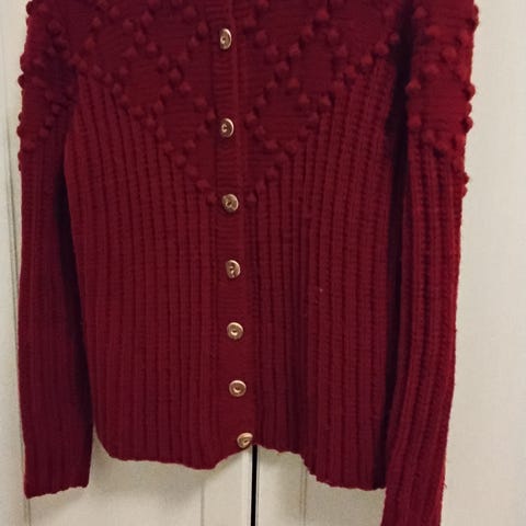 Myydään especially made for Pentik by knitting shop Helsinki - valmistama villatakki. Yläosassa yksi nappi, muuten avoin malli. Taskut edessä. Materiaalilappua ei ole, mutta pesuohjeena "käsinpesu 30".