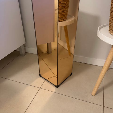 Kukkapylväs tukeva Puinen. Pientä käyttökulumaa, ylätasossa jälkiä jotka näkyvät toisessa kuvassa. Muutoin yleisilmeeltään siisti. Yläosan mitat 25x25 cm, korkeus 90 cm.