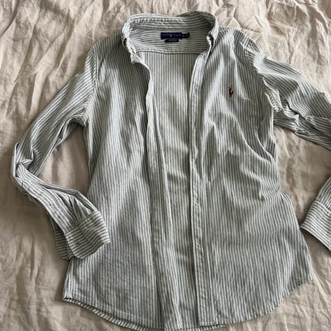 Tummansininen valkoisilla raidoilla, pitkähihainen 100% puuvillaa, merkki Ralph Lauren, edessä röyhelö samasta kankaasta kuin itse pusero, napit alas asti.