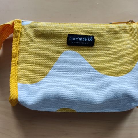 Myydään Marimekon Kaika Pikku Lokki meikkipussi, joka on valmistettu puuvillasta ja jossa on Maija Isolan suunnittelema aaltomainen kuviointi.