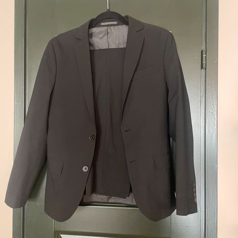 Poikien tumman sininen puku, kapeaa slim fit mallia. Mukaan musta kauluspaita.
