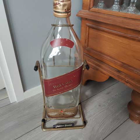 Johnnie Walker Red Label -viskipullo, jossa on metallinen kallistusteline. Pullon tilavuus on 4,5 litraa.Tämä pullo edustaa klassista viskimerkkiä, joka on tunnettu ympäri maailmaa. Johnnie Walker on ikoninen brändi, joka on ollut olemassa vuodesta 1820 lähtien.Pullo on tyhjä ja siinä ei ole näkyviä vaurioita. Teline on hyvässä kunnossa.
