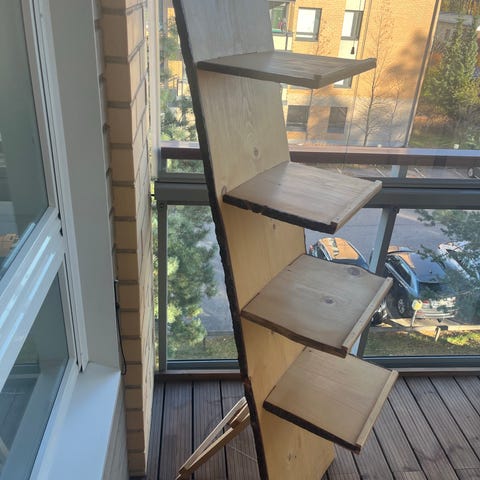 Rustiikkinen hylly taso. Korkeus mitattu ilman naruja. Muuten hyväkuntoinen, mutta tasot ovat hieman vääntyneet. Itse tehty. Ollut meillä seinälle ripustettuna.