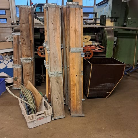 11 lavakaulusta ja kaksi lavaa. Siirretty seinän viereen odottamaan