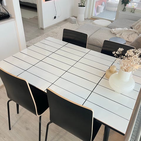 Sotka ruokailuryhmä, johon kuuluu ruokapöytä ja neljä tuolia. Ryhmä on väriltään valkoinen. Materiaali vaikuttaa olevan maalattua puuta tai puupohjaista levyä. Sopii neljälle hengelle keittiöön tai ruokailutilaan. Saa suurennettua 6 hengelle, jatkopala tulee mukaan. Kulumaa löytyy, kuvista näkee.