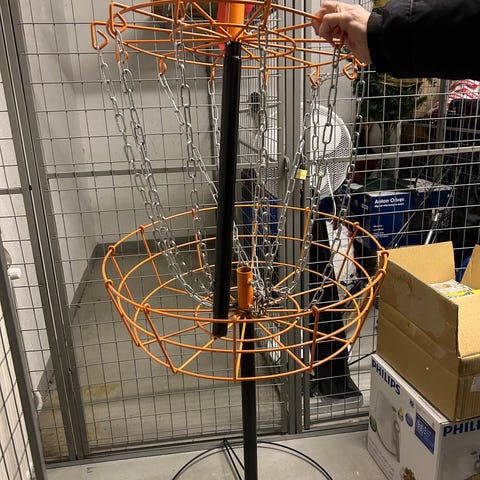 Näppärästi mukana kulkeutuva frisbeegolf kori.