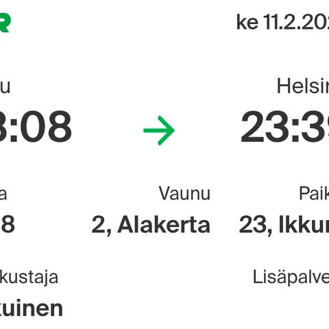 VR junalippu Kokkola–Oulu aikuinen