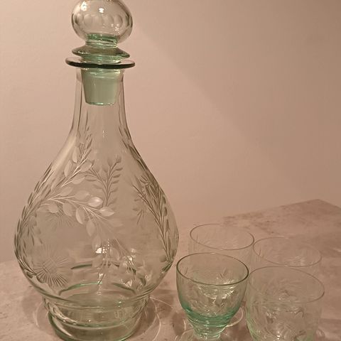 Vihreä karahvi hiukan eri sävyistä vihreää kuin lasit ja korkki. Korkki jumissa karahvissa, saa varmaan irti, mutta itse en ole yrittänyt, koska ollut vain koristeena.