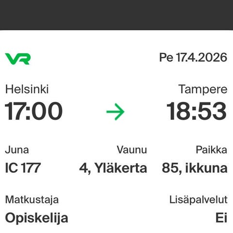 VR sarjalippu Helsinki–Tampere 20 matkaa voimassa 2.5.2026 asti