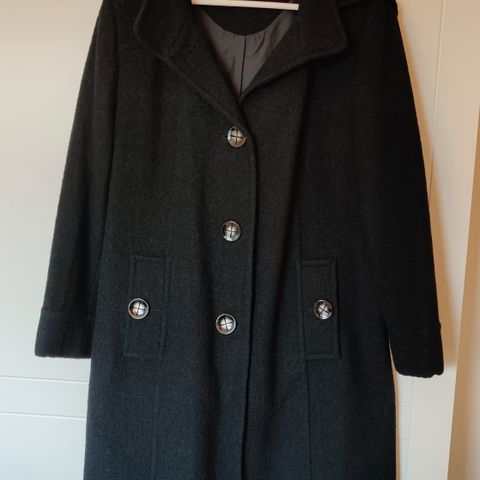 Upealla isolla hupulla varustettu lämmin musta villakangastakki koko 44. Haloselta hankittu, käytetty vain pari kertaa juhlatakkina talvella sukujuhlissa kuten häissä tai ristiäisissä. Tiivis ja paksua kangasta polyesteri/villasekoitetta.