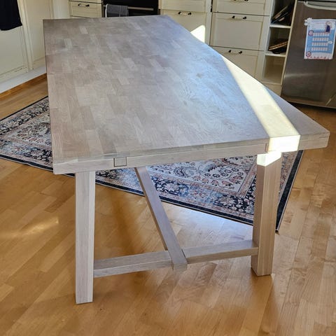 Ostettu syksyllä 2022. Lapsiperheen käytössä olleena pöytälevy ei ole virheetön, lakka paikoitellen kulunut, kts. kuva neljä, mutta oikein siisti yleisilmeeltään ja tuolit täysin ehjät eikä kulumaa.