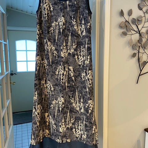 Kuviollinen Nümphin mekko, koko 40. Napitus edessä, pitkät hihat, taskut. 100 % viskoosi/Ecovero. Savuton koirakoti.
