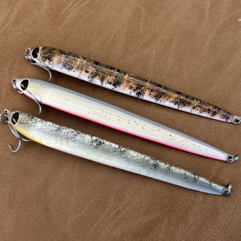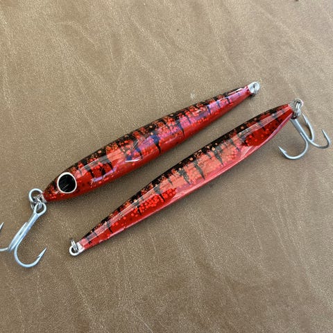 Kolme kappaletta Suomessa käsin valmistettuja kevennettyjä lusikkauistimia. Nämä vieheet on tehty uitettavaksi matalassa vedessä, jossa meritaimenet viihtyvät keväisin ja syksyisin. Perusuinti on eloisa, mutta epäsäännöllisellä kelauksella vieheet saa uimaan villisti poukkoillen, mitä taimenet eivät voi vastustaa. Pituus 110 mm ja paino noin 25 g. Nämä värit ovat omia suosikkejani etenkin tyrskytaimenen kalastamiseen syksyllä.