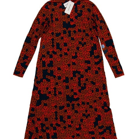 100% puuvilla, kangas ei juurikaan jousta. Vuoriton. Pohjaväri vaalea, tummat kohdat tummansiniset, unikkokuviot persikanväriset.