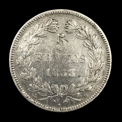 5 frankia - Louis-Philippe I1832-1843Kolikot › yleisesti kiertävät kolikotPrata 900‰ • 25 g • ⌀ 37 mmKM# 749, Franc 2014# 324, Gad 1789# 678, N# 3653