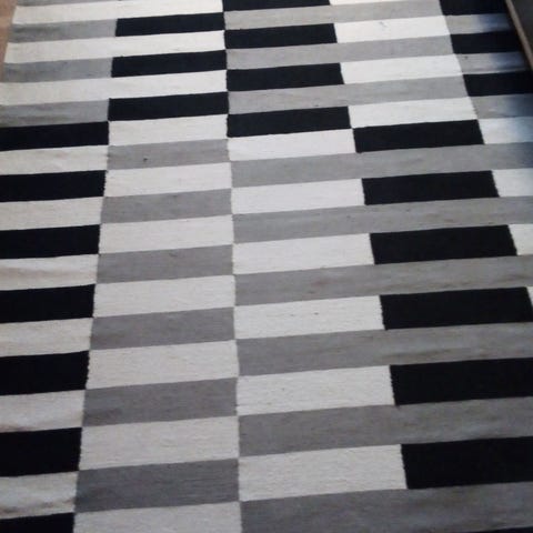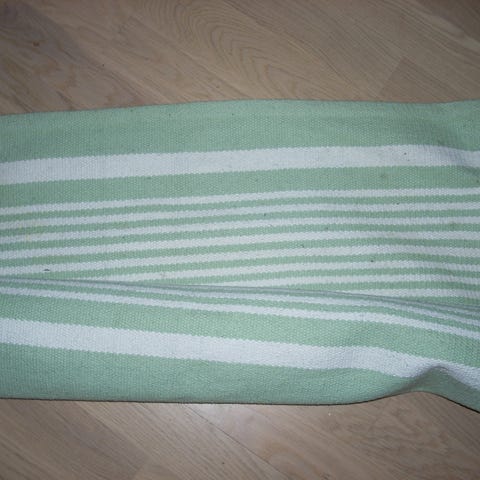 Ihanan kevyt ja mukava jalan alla. Puuvillaa. Pesun tarpeessa, muuten hyväkuntoinen. Askosta muistaakseni ostettu.