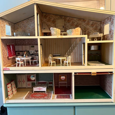 Lundby nukkekoti alakerros. Olisikohan 90-luvulta. Erittäin hyväkuntoiset tapetit, ikkunapleksit paikoillaan ja ovenkahvat ehjät. Ainut miinus että ulkoseinät on maalattu valkoiseksi.