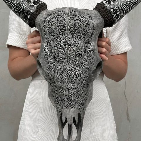 Käsin kaiverrettu lehmäkallo, jonka ovat kaivertaneet käsityöläiset, jotka ovat siirtäneet muinaisen kaiverrataiteen perinnettä isältä pojalle.Kallo on kokonaan käsin veistetty suurella huolella. Se on epätavallinen koriste-esine.Kaiverrettu on kaunis moottoripyöräaihe.Arvioidut mitatPituus: 61 cmLeveys: 46 cmVastuunvapaus- Sarvet irrotetaan kuljetusta varten, ja ne on helppo kiinnittää takaisin. Sarvet ovat aina pakattuna laatikon pohjalle, kallon alle. Varmista, että poistat sarvet ennen pakkauksen hävittämistä.- Koska kyseessä on luonnollinen kallo, siinä saattaa olla joitakin luonnollisia pieniä halkeamia, uurteita tai puuttuvia hampaita. Tämä on normaalia. Katso kuvat viitteeksi.- Kallomme puhdistetaan ammattilaisvoimin, mutta joskus hampaissa voi esiintyä pieniä värimuutoksia. Tämä on luonnollista ja normaalia, eikä siihen voida paljoa vaikuttaa. Katso kuvat ohjeiden tueksi.Olemme lisänneet kuvia käsityöläisistämme työssään antaaksemme kuvan siitä, millainen prosessi on kaiverratetun pään luominen.Paino, joka mainitaan, sisältää pakkausmateriaalin.LähetysKohde lähetetään seurantanumerolla DHL Parcelin, DPD:n tai postNlin kautta. Seuranta päivittyy Catawiki-luettelossasi, kun pakettisi on jätetty postiin.Ole hyvä ja tarkista säännöllisesti välttääksesi pakettisi palautumisen meille, jolloin ostaja vastaa toisen lähetyksen toimituskuluista.Seurantaan Espanjaan ja Portugaliin käytä tätä linkkiä ja lisää Catawiki-erästäsi saatu seurantanumero.https://clientesparcel.dhl.es/LiveTracking/HomeEMME YHDISTÄ TOIMITUKSIA!!!- Jos sinulla on kysyttävää paketistasi, ota yhteyttä meihin Catawiki-viestipalvelun kautta. Yritämme vastata kolmen työpäivän kuluessa.