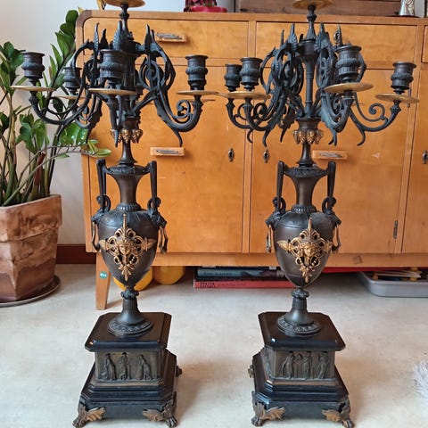 Tämä tyylikäs 1800-luvun kynttelikköpari on valmistettu kullatussa metallissa, todennäköisesti messingistä, ja siinä on rikas koristelu, joka on saanut vaikutteita Rococo- ja Louis XVI -tyyleistä. Jokainen kappale seisoo neliönmuotoisen jalustan päällä, jossa on koristellut jalat, ja alaosassa korostuu relief-medaljonki, jossa on profiilikuva naisesta, ja se on kehystetty seppeleillä ja klassisilla motiiveilla, jotka herättävät esiin ranskalaisen neoklassisen estetiikan.