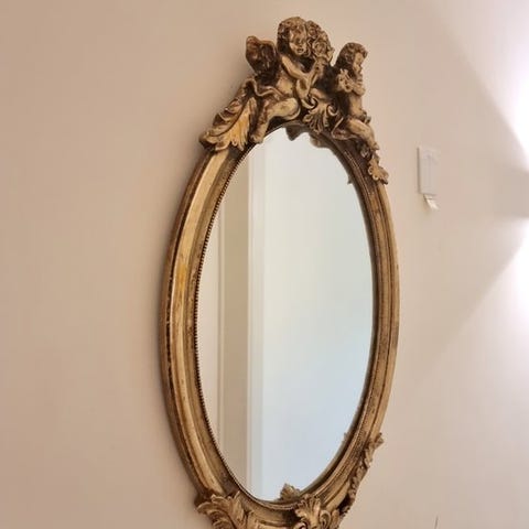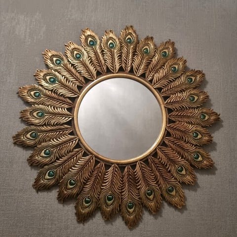 Upea peili. Kultainen väri. Erittäin kaunis muotoilu. Mitat ovat seuraavat (+/-):Korkeus: 36 cmLeveys: 36 cmKaikki tuotteemme lähetetään hyvin pakattuina ja vakuutettuina.Regency / auringonpeili / 1950-luvun sisustus
