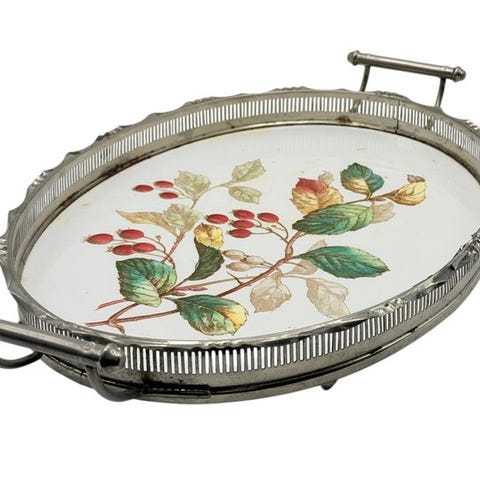 Kyse on suurikokoisesta Art Deco -tarjoilualustasta kahvoin. Tarjottimen laatassa oleva geometrinen motiivi on suunniteltu noin vuonna 1920 ja liitetään hollantilaisen taiteilijan Chris van der Hoefin nimeen saksalaiselle valmistajalle Gebrüder Mehner. Viimeisen vuosisadan lopussa Jeroen van der Burg ja Jolanda Frentz suunnittelivat saman kuviokuvion mukaisen astiaston. Tämä astiasto "Chris" on tuotettu pienessä erässä Saksassa.Se seuraava tieto on relevanttia:Suunnittelija: liitetty Chris van der Hoefille (1875–1933)Yritys: Gebrüder MehnerValmistuskausi: noin 1920Materiaali: posliini ja metalliMitat: Pituus x Leveys x Korkeus = 52,5cm x 34cm x 7cmPaino: 1938 grammaaKunto: Erinomainen (Laatasta ei ole lohkareita tai sirpaleita, ja kuva on kirkas.)Tämä Art Deco tarjoilualusta pakataan huolellisesti ja lähetetään rekisteröitynä sekä vakuutettuna, mutta sen voi myös noutaa sopimuksen mukaan Edel Erfgoedilta Klarenbeekissä, Alankomaissa (Apeldoornin lähettyvillä).