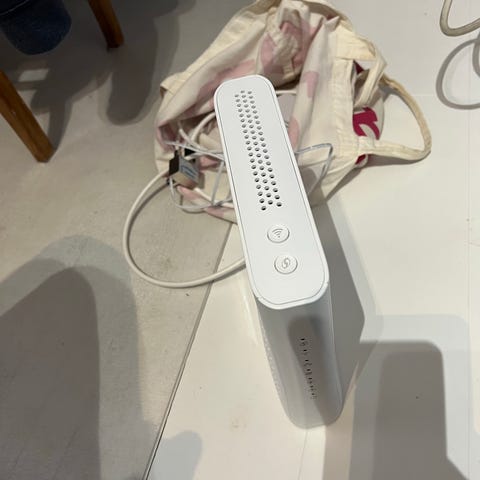 DNA kaapelimodeemi / reititin valkoinen. Laitteessa on useita Ethernet‑portteja lähiverkkoyhteyksille. Mukana virtalähde. Jäänyt tarpeettomaksi. Piilotettu tehdasasetukset.