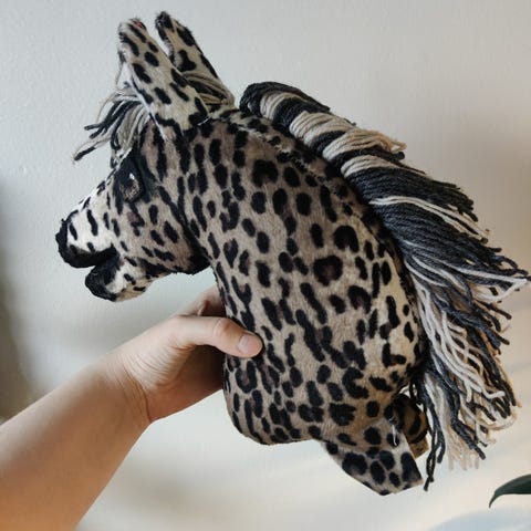 Käsityönä velboa tyyppisestä sileästä karvakankaasta valmistettu kultainen liinakko keppihevonen.