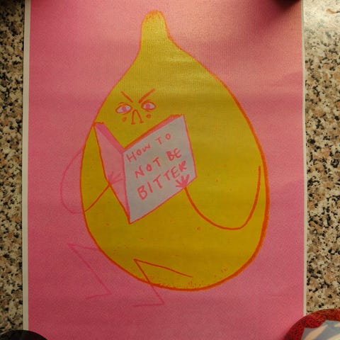 Myydään värikäs ja leikkisä taidejuliste, jossa stilisoitu hummeri kirkkaissa pinkin, keltaisen ja sinisen sävyissä.