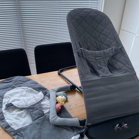 Babybjörn sitteri ja lelukaari, käännettävä kangas erinomaisessa kunnossa. Lelukaaressa pientä käyttöä haittaamatonta kulumaa.